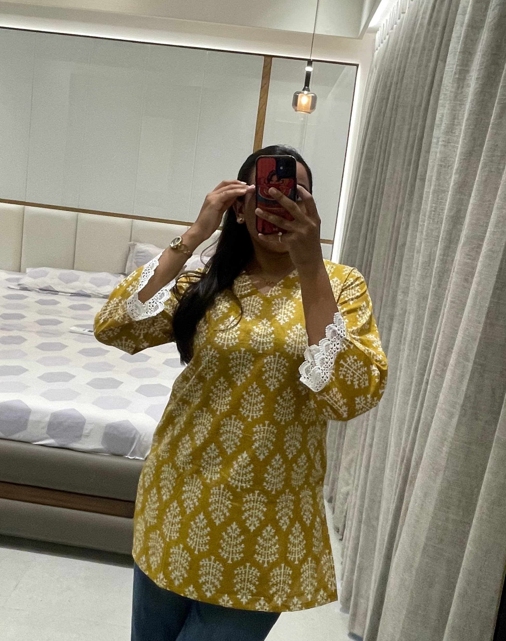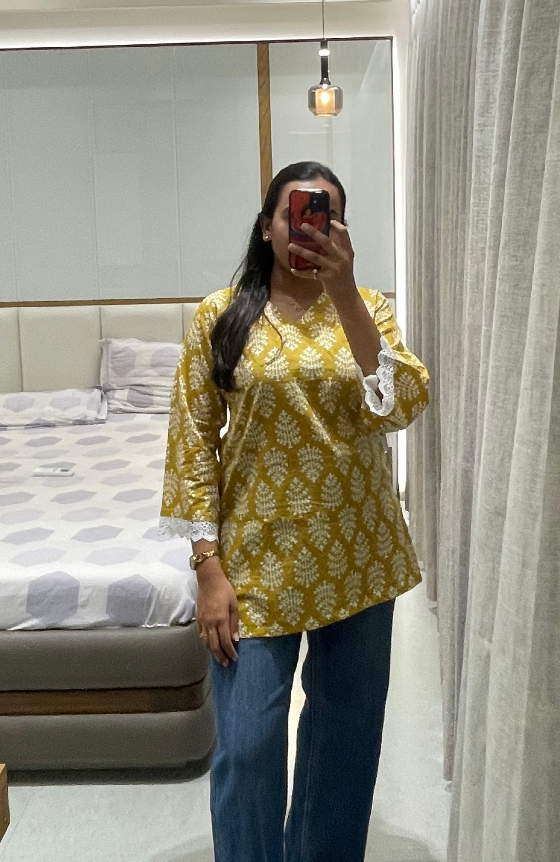Crafted from breathable Jaipuri cotton, the Yellow Petal top offers both style and ultimate comfort. It features a unique v neckline with a tie-up detail and three-quarter sleeves beautifully trimmed with delicate white lace. The golden yellow fabric is adorned with a charming white petal print, creating a fresh and elegant look. This piece is perfect for a stylish and comfortable day out.